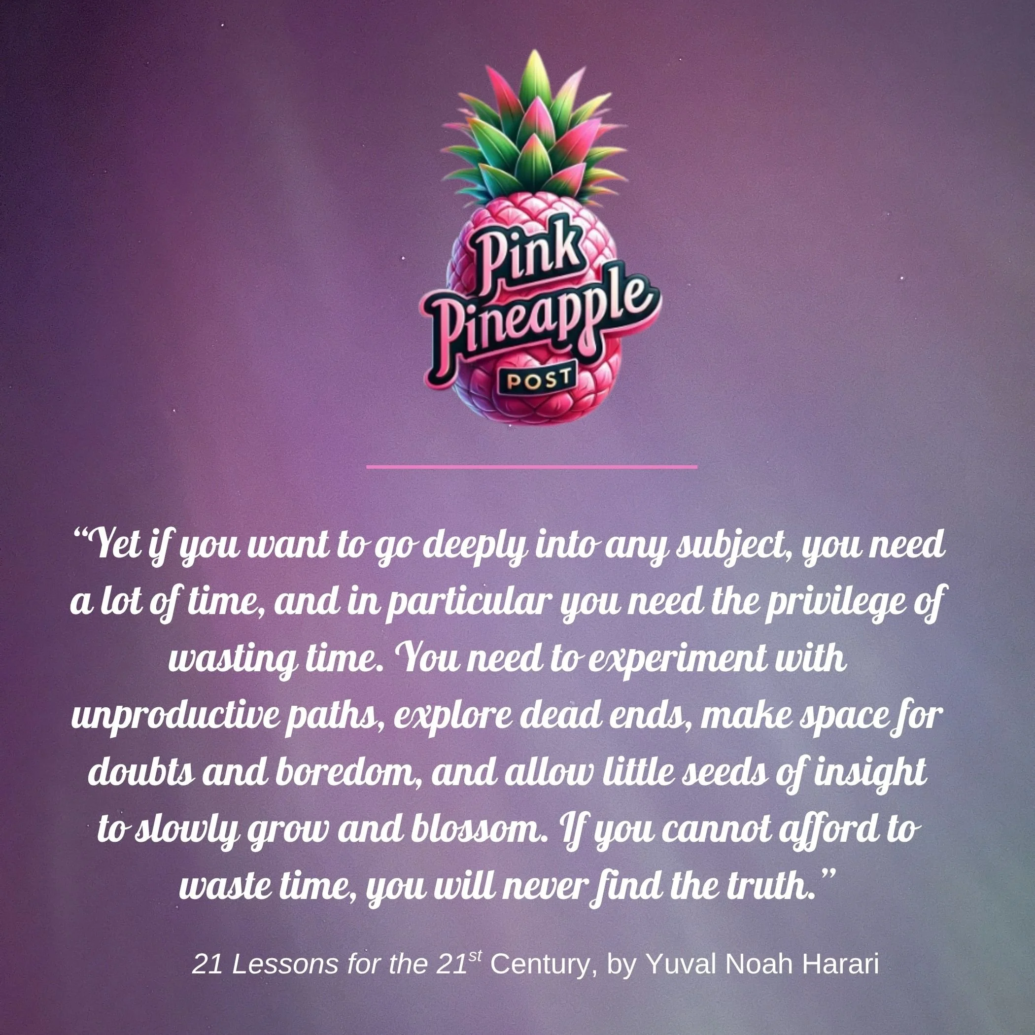 “Yet if you want to go deeply into any subject, you need a lot of time, and in particular you need the privilege of wasting time,” writes Harari. “You need to experiment with unproductive paths, explore dead ends, make space for doubts and boredom, and allow little seeds of insight to slowly grow and blossom. If you cannot afford to waste time, you will never find the truth,” he argues.