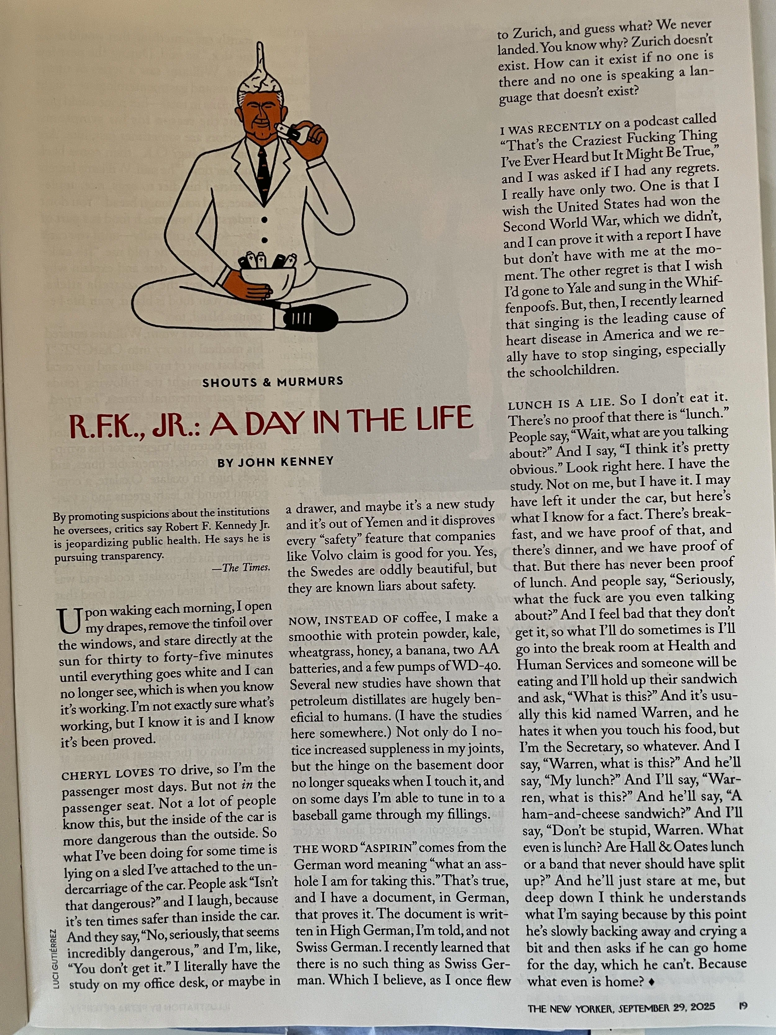 I stumbled across this satirical essay about the Secretary of Health and Human Services, R.F.K., Jr., and found myself truly laughing out loud. It’s utterly ridiculous, of course, in the tradition of “A Modest Proposal” by Jonathan Swift, which if you’ll recall recommends eating babies as a solution to poverty. Read on for the essay in its entirety.